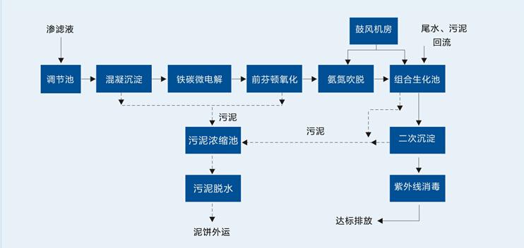 本工艺采用 预处理—组合生化处理模式,在预处理阶段对垃圾渗滤液进行调整,保证预处理出水稳定在一定的范围内,对后续生化工艺有利,并使得最终出水能达到国家标准,整套工艺能适宜处理不同阶段的渗滤液。